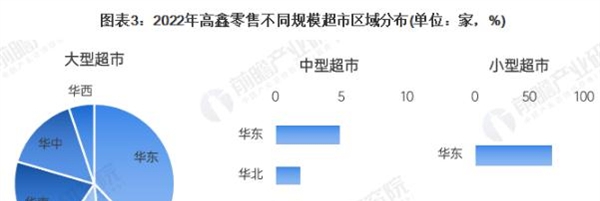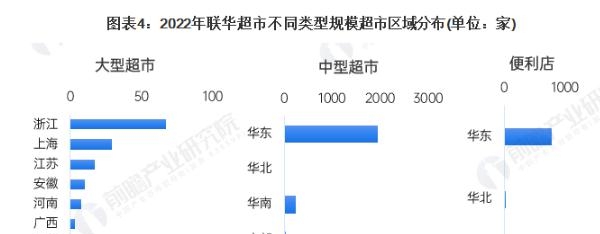 以行业领先的超市品牌为例分析,高鑫零售主要以大型超市业态为主,联华超市主要以中型超市业态为主。截至2022年财年中期,高鑫零售大型超市主要分布于华东和华南地区,分别有大卖场185家和98家。公司大型和中型超市大约7%位于一线城市,16.5%位于二线城市,47.2%位于三线城市,21.4%位于四线城市,7.8%位于五线城市。2022年,联华中型超市累计共2268家,其中有85.76%的超市分布于华东地区。