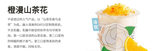 不容错过的人气产品,以“山茶花香乌龙茶”为底,融入清爽的OATLY定制燕麦奶,不含乳糖,乳糖不耐受的伙伴也可尽情享用。第一口是淡淡的山茶花香,第二口是热烈明媚的橙子香气,第三口是燕麦奶的麦香,清甜不腻,回味无穷。