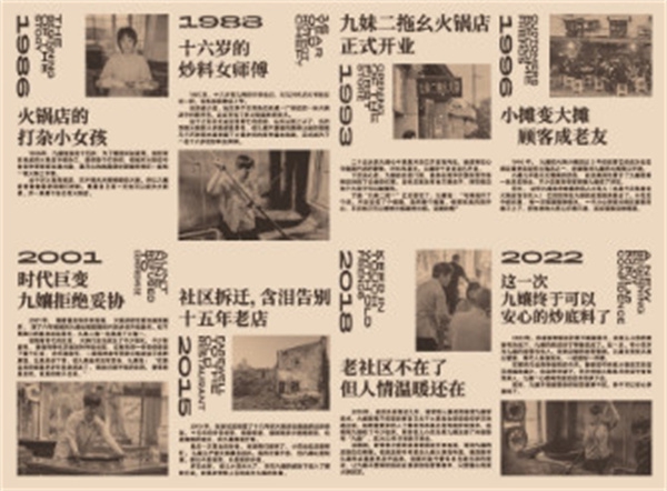 二十出头的九嬢心中满是对自己开店的向往,她经常在心中盘算开店的事情,1993年夏天,九嬢终于决定自己开店。下定决心后,九嬢四处找门面,最终在南坪后堡农贸市场附近找到了合适的位置,当时店里没有地方摆桌子,好在路边有个大坝子可以随便用。于是“九妹二拖一”正式面世了,九嬢说:“与其说开了个店,不如说摆了个摊摊,虽然是个摊摊,但那阵真的很开心,不仅自己可以想吃火锅就吃火锅,还能找钱”