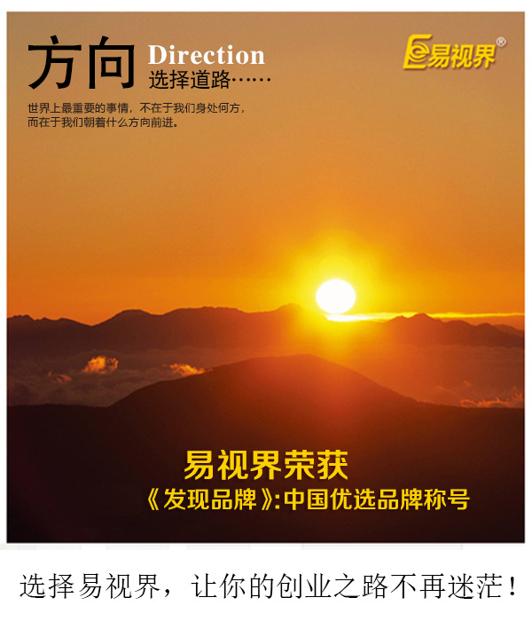 易视界已经实现了管理规范化、科学化及运营模式化,拥有阵容强大的技术研发团队、优秀的市场运营团队、于业界的企业商学院以及完善的客户服务支持系统,造就了一批精诚合作的商家,拥有一批忠实的客户,经受住了市场的考验和客户的检验,取得了良好的经济效益和巨大的社会效应。目前公司正在加大技术研发力度和加快市场布局速度,在同行业始终处于知名、地位,正是商家投资的最好时机,也是市场的大势所趋!易视界品牌连锁机构期待与您精诚合作、共创未来!