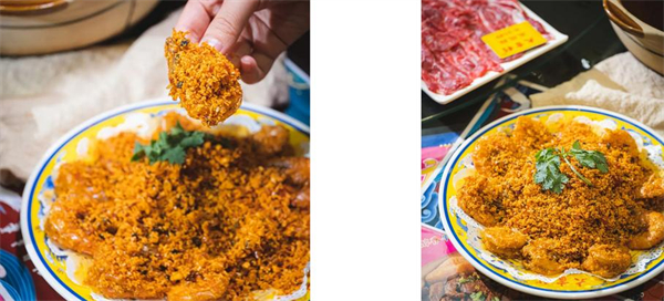 小酥肉在牛肉火锅店里,摇身一变成了小酥牛肉,外层焦香,里面多了份劲道,蘸上椒盐粉或者甜辣酱,有不一样的风味~