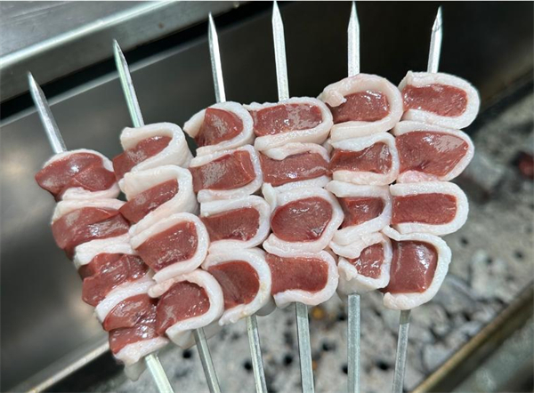 二是外层所包裹的肥油,选用猪脊膘替代腹膘,油脂在烤至过程中,既可以渗入又不至于完全融化,让腰子外焦里嫩。