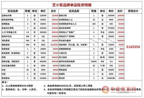 芝小官投资费用以店面积900㎡为例,请看下费用表格,如果您想要获取更多投资费用详情,可拨打总部加盟电话或者前往总部面议。
